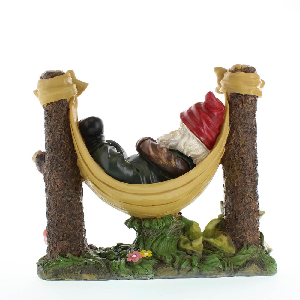 • Indoors or out, this fanciful statue adds a touch of whimsy that's sure to warm the heart of any hardworking gardener! After a long day's labor, a rosy-cheeked gnome settles into his favorite hammock to enjoy a well-earned rest.