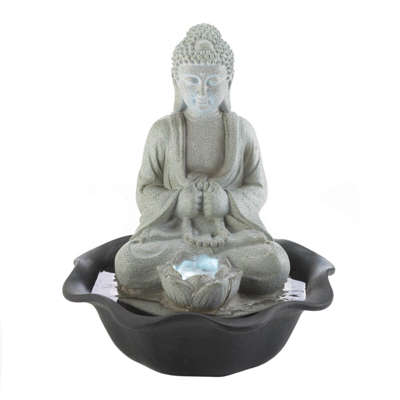 • Bring nature inside with this serene meditating buddha tabletop fountain. The indoor water fountain is made from durable polyresin to give it a stone-like appearance. It also includes an LED light for a stunning evening display. The calming water sounds and natural stone design will turn your space into a place of Zen. Place on the entryway table to greet guests, in a master bath for a tranquil soak in the tub, or any else you think this might fit perfectly.