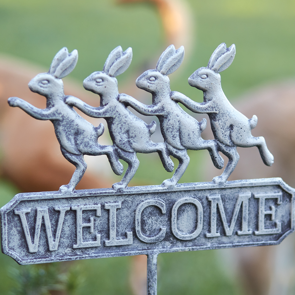 Our dancing bunnies are the most endearing welcome. Place this cast iron garden stake along a walkway or at an entrance of a garden.