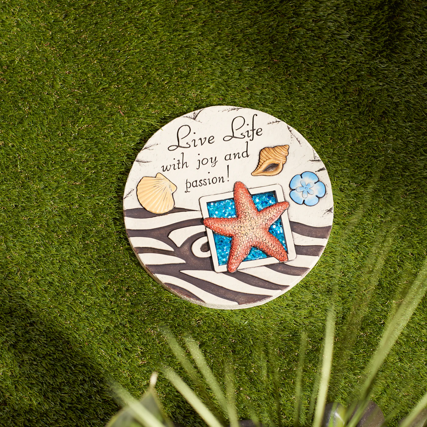 • Bring the beach home to your yard! Turn your garden into a place of gathering with this warm and inviting welcome stepping stone. The glitter overlay makes the starfish pop and emits a subtle sparkle in the sunlight.